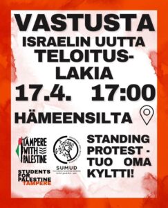 Osana maailmanlaajuista Palestiinan solidaarisuusliikettä tavoitteenamme on lopettaa Suomen tuki Israelin apartheidille ja muuttaa se tueksi demokratialle, dekolonisaatiolle ja ihmisoikeuksille.
