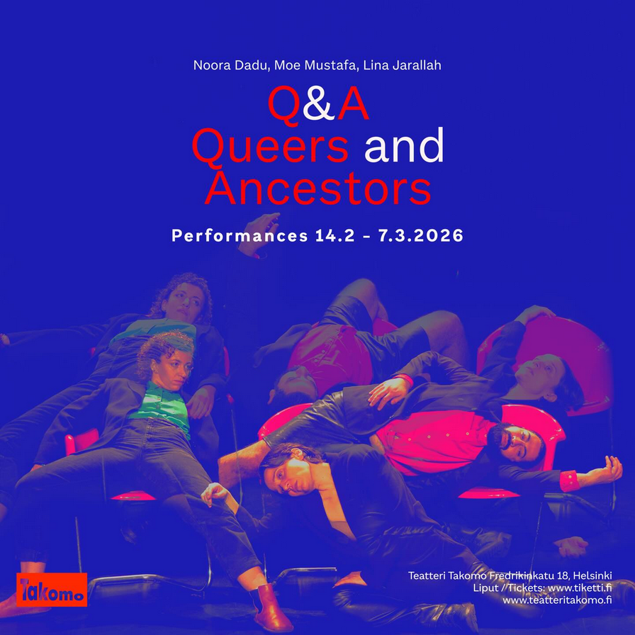 The stage work Q&A – Queers and Ancestors by Noora Dadu, Moe Mustafa and Lina Jarallah at Teatteri Takomo, in Helsinki. The performance starts with three people put together in a panel discussion on Palestine and Queerness, where they are expected to explain their existence, but how existence could be explained if there is no safe space available in any society.