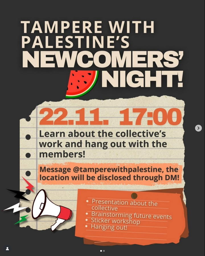 DM @tamperewithpalestine in Instagram if you’d like to join the event on 22.11. and they will provide you with the location details.