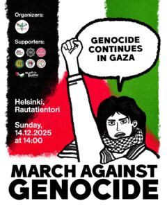 As part of the global movement in solidarity with the Palestinian people, our goal is to end Finnish support for Israeli apartheid and turn it into support for democracy, decolonisation and human rights.