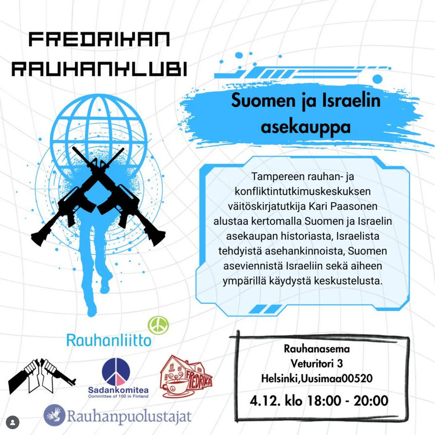 Fredrikan Rauhanklubilla 4.12. Tampereen rauhan- ja konfliktintutkimuskeskuksen väitöskirjatutkija Kari Paasonen alustaa kertomalla Suomen ja Israelin asekaupan historiasta, Israelista tehdyistä asehankinnoista, Suomen aseviennistä Israeliin sekä aiheen ympärillä käydystä keskustelusta. Tapahtuman järjestävät Aseistakieltäytyjäliitto, Sadankomitea, Suomen Rauhanpuolustajat Rauhankahvila Fredrikassa Helsingissä klo 18-20.