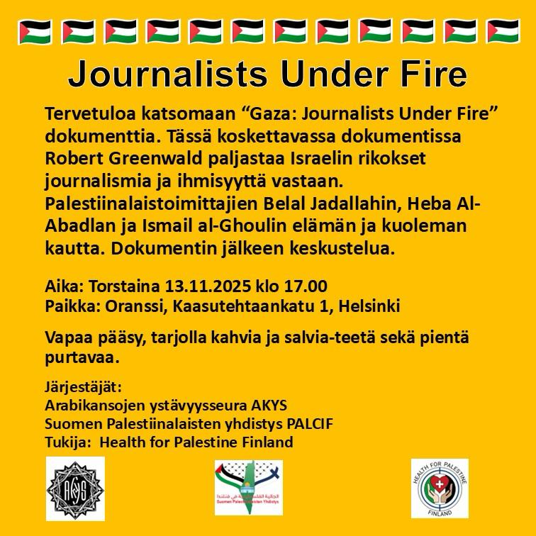 Palcif, Arabikansojen ystävyysseura ja Health for Palestine Finland näyttävät dokumentin Journalists Under Fire torstaina 13. marraskuuta klo 17 Kulttuurikeskus Oranssissa (Kaasutehtaankatu 1, Helsinki).