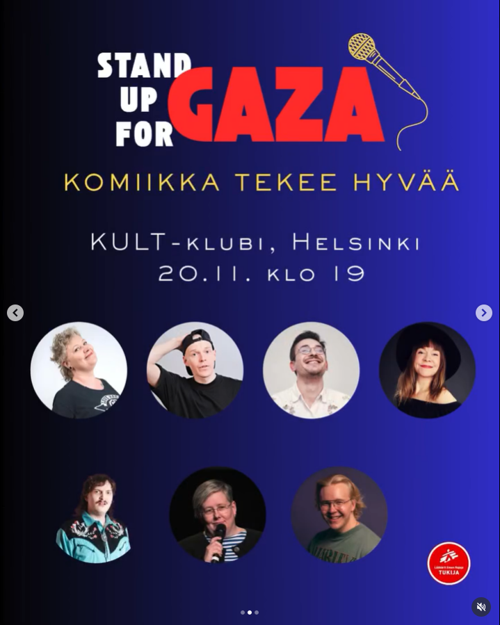 Komiikka tekee hyvää! Suomen eturivin stand up -koomikot kokosivat voimansa ja keräävät Stand Up for Gaza -hyväntekeväisyysilloilla tukea Gazan kriisialueelle.