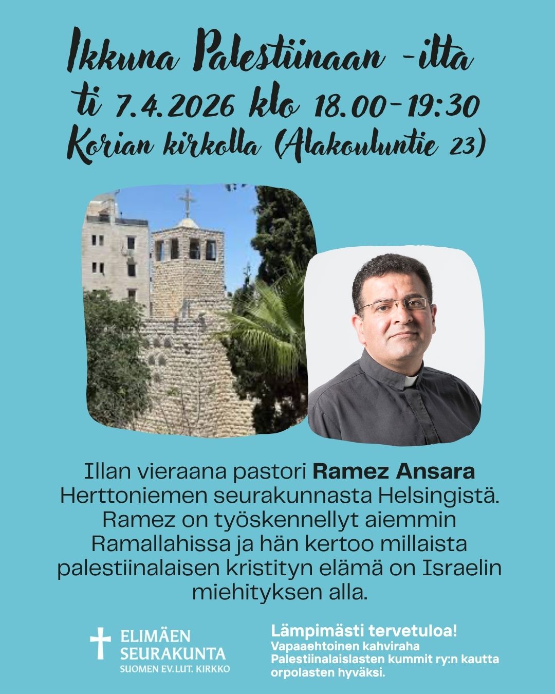Illan vieraana on pastori Ramez Ansara Herttoniemen seurakunnasta Helsingistä. Ramez on työskennellyt aiemmin Ramallahissa ja kertoo millaista palestiinalaisen kristityn elämä on Israelin miehityksen alla.