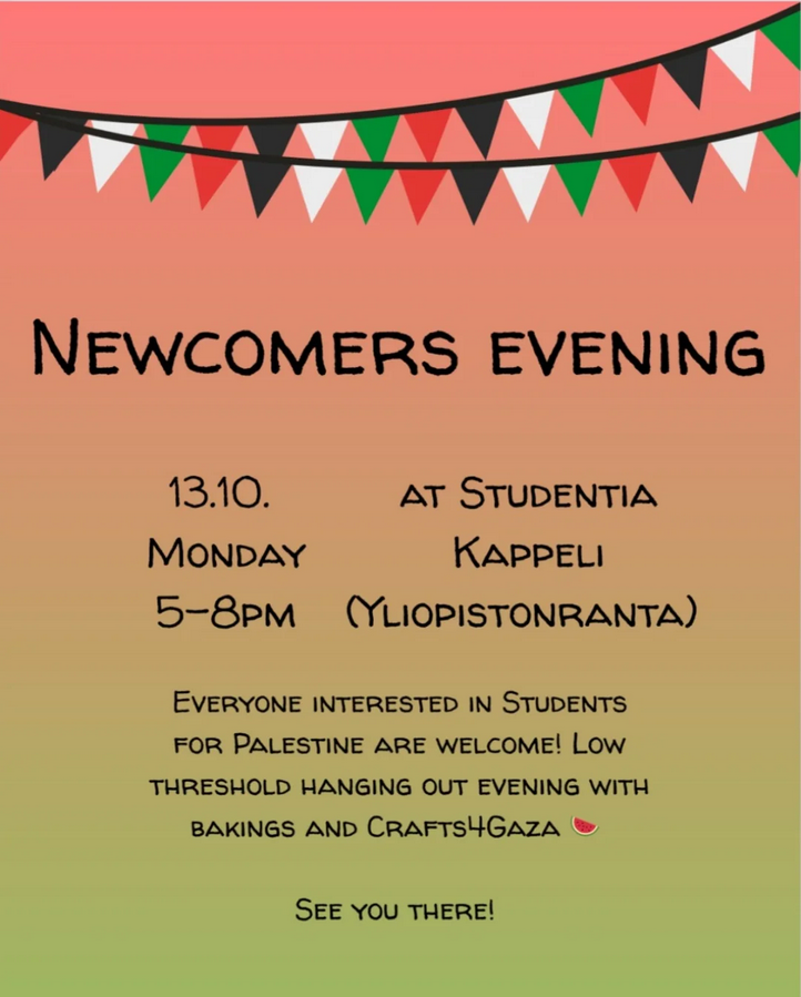 Student for Palestine Kuopio järjestää uusien illan maanantaina 13. lokakuuta klo 17-20 Studentian Kappelissa, Yliopistonranta 15, Kuopio.