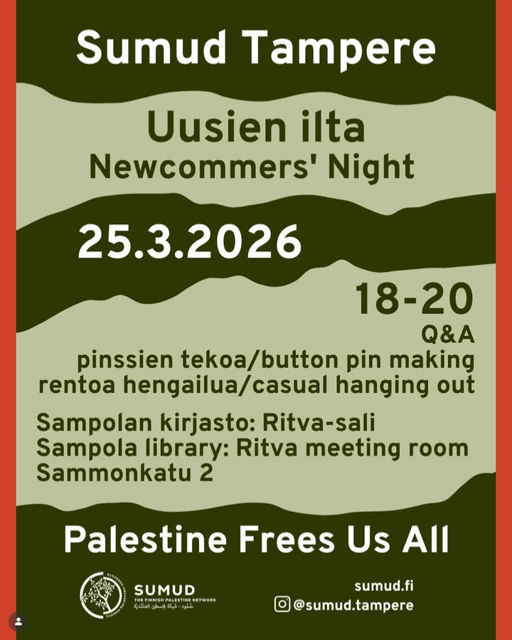 Tervetuloa tutustumaan Sumud Tampereen toimintaan ja jäseniin Uusien illassa 25.3.2026 klo 18-20.